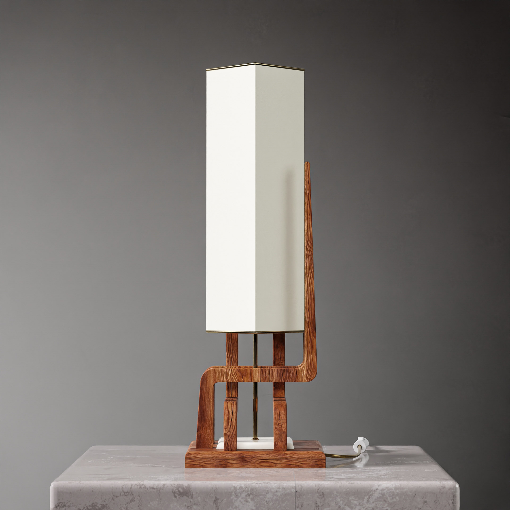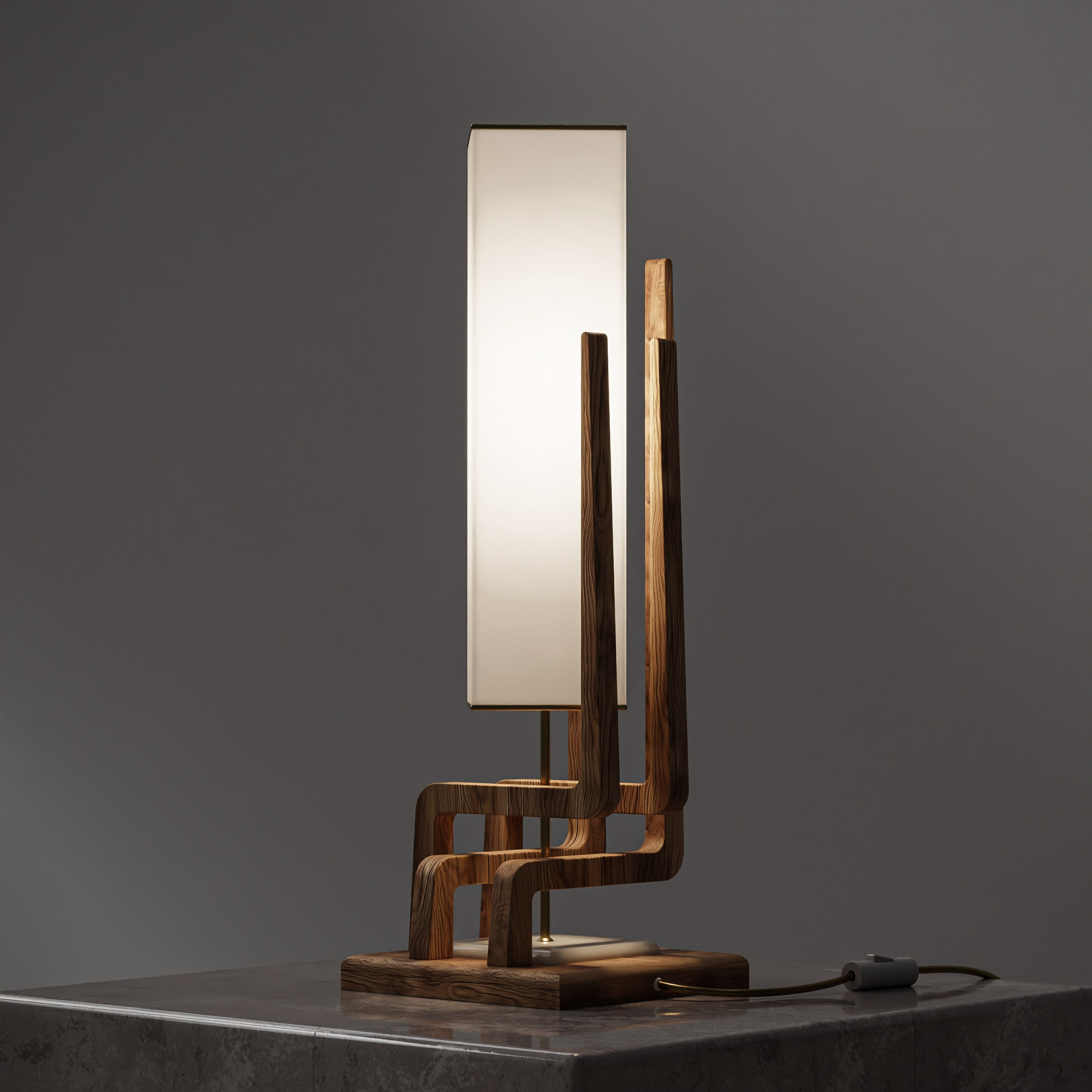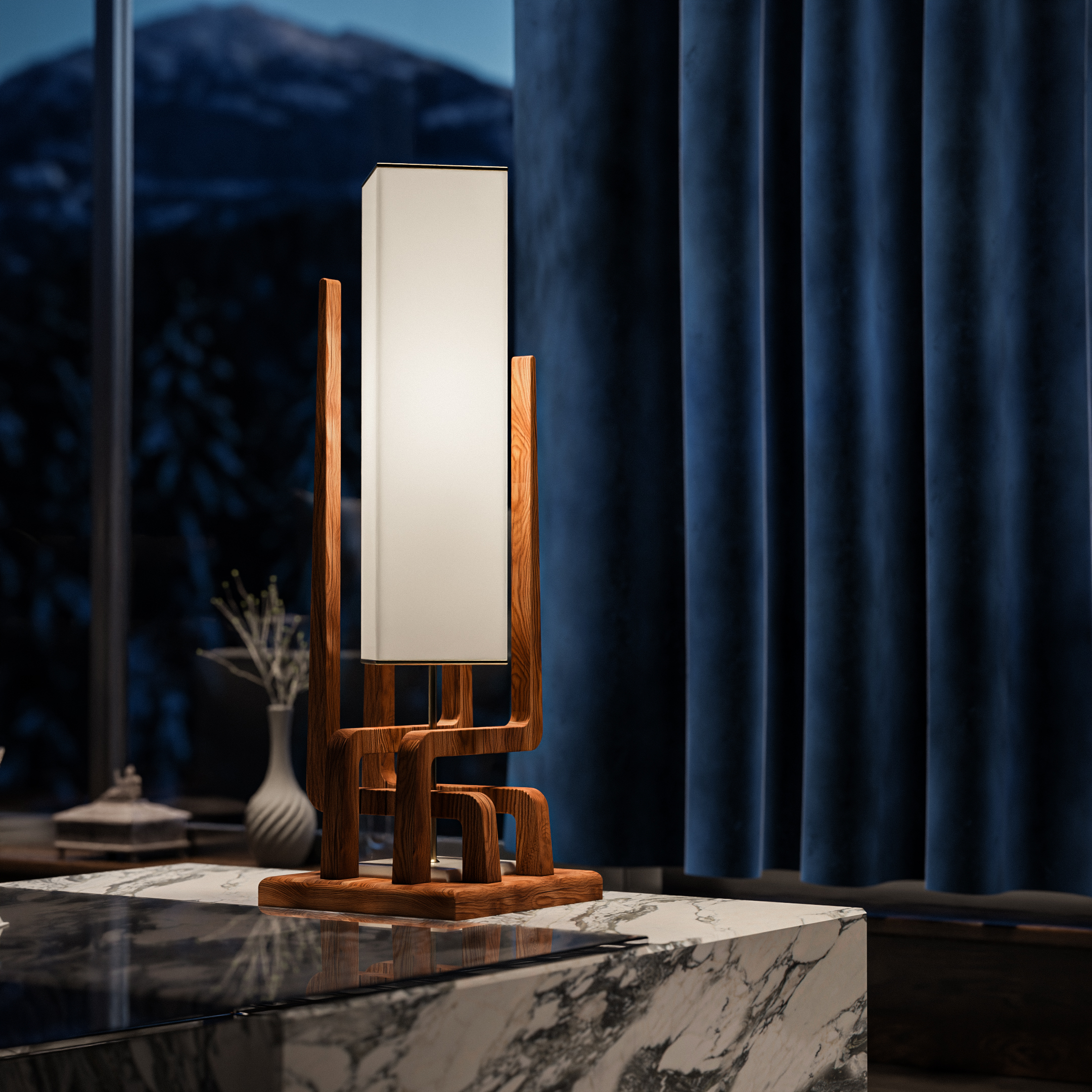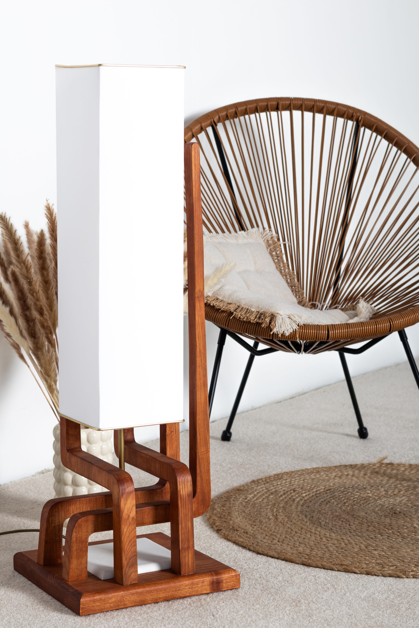 The lamp features a slender, rectangular shade body, mounted on a solid base. The shade is supported by a wooden structure with distinctly curved lines. The design seamlessly blends modernity with natural materials, creating an ideal fusion of nature and contemporary technology.