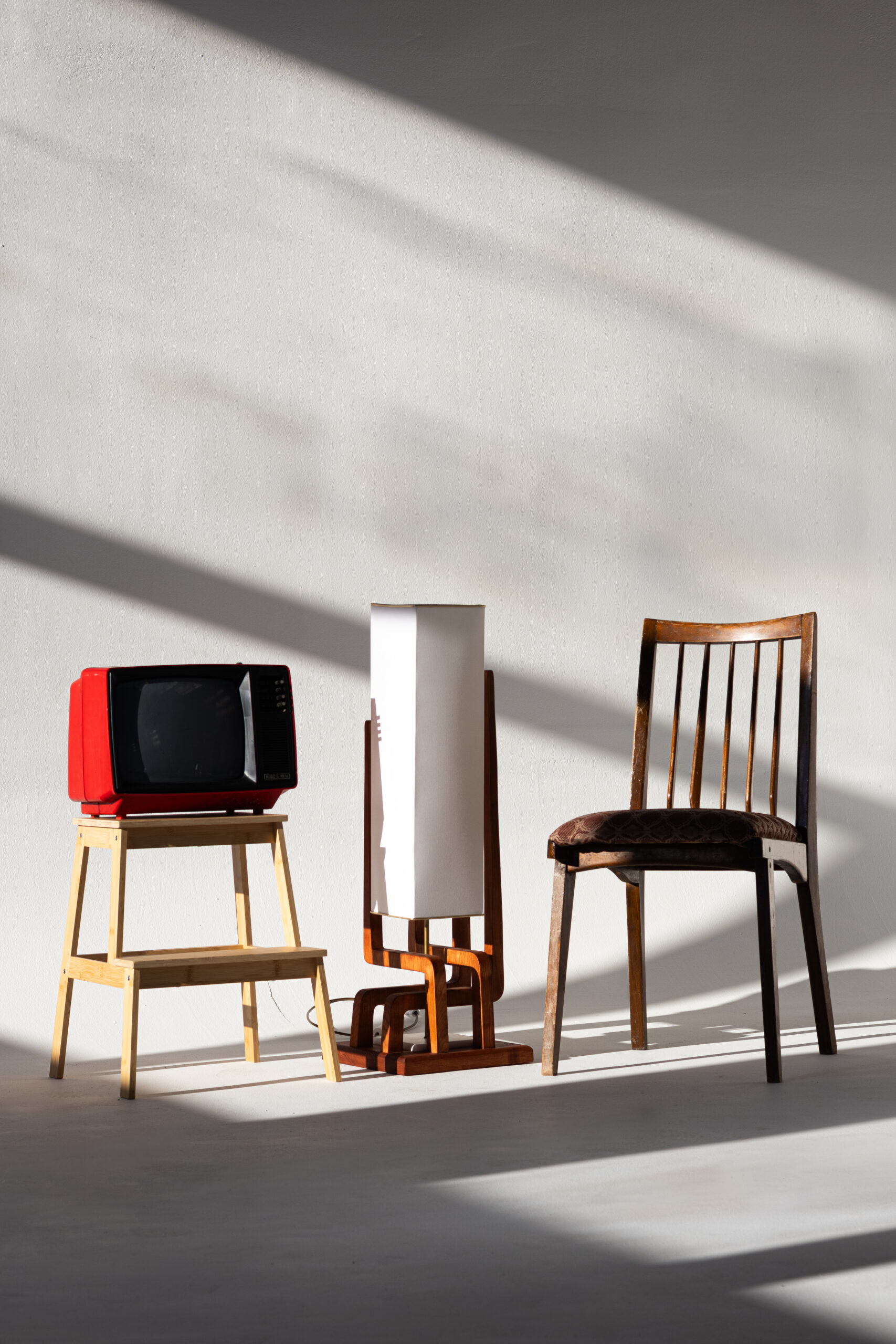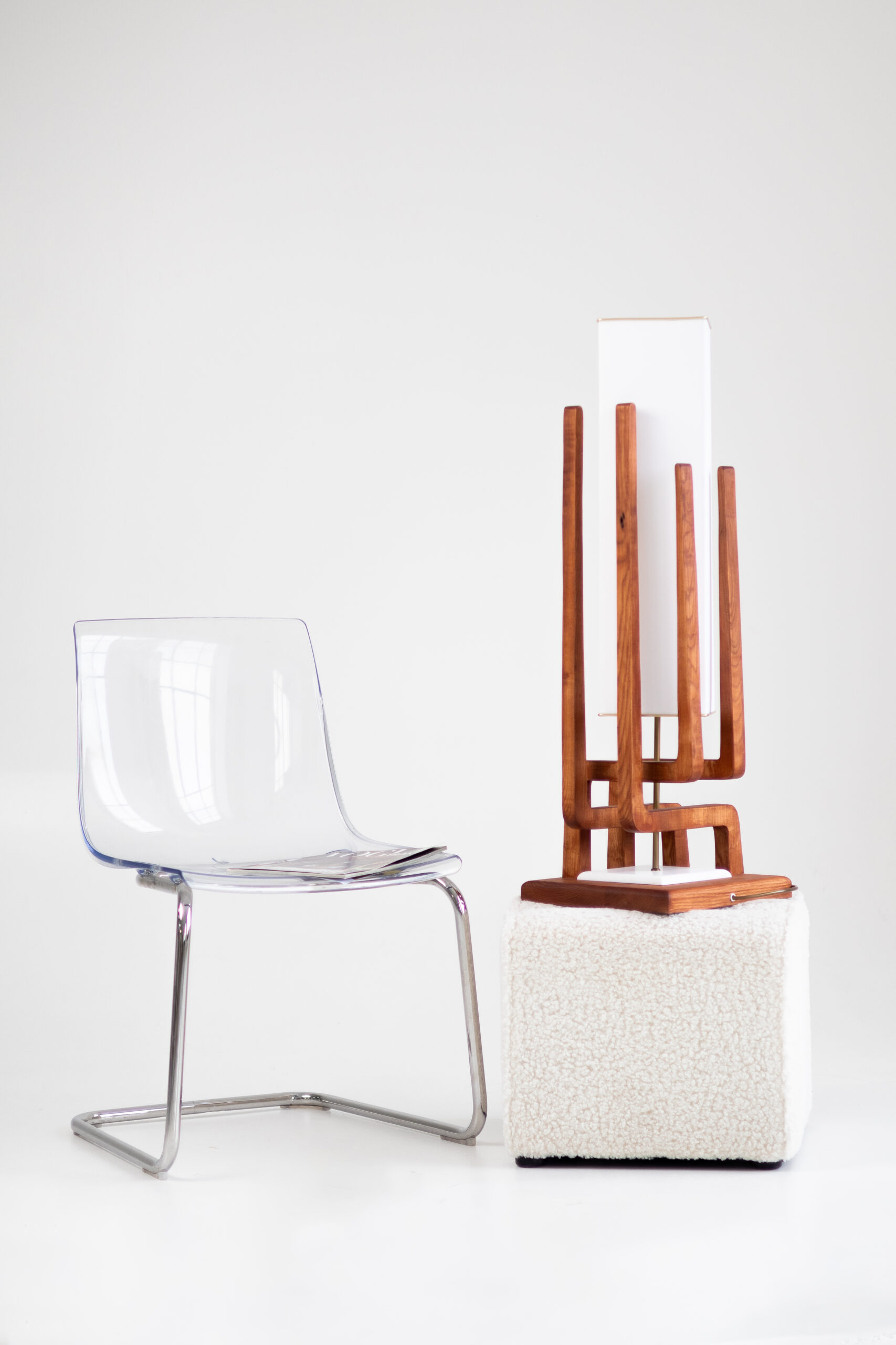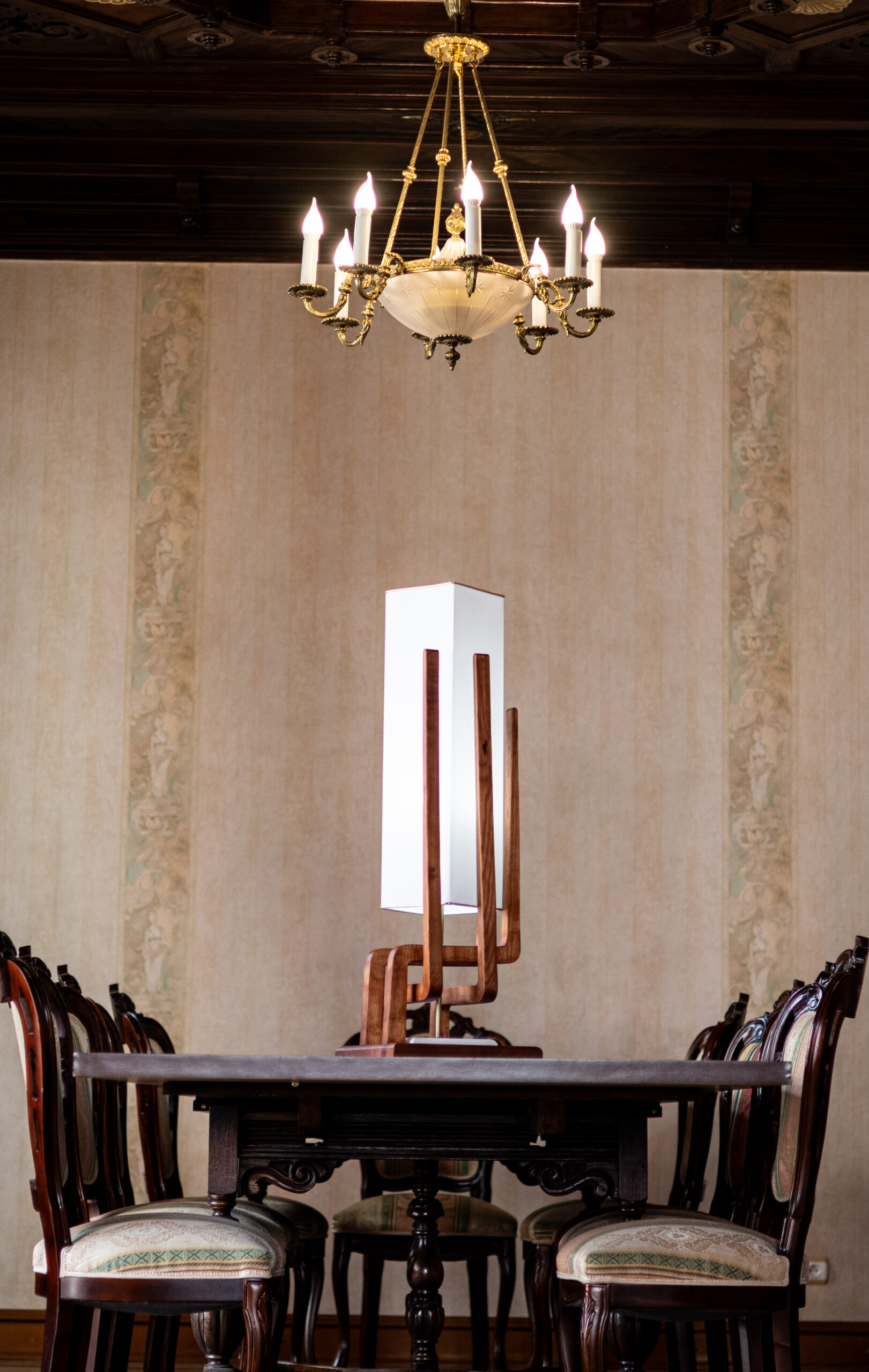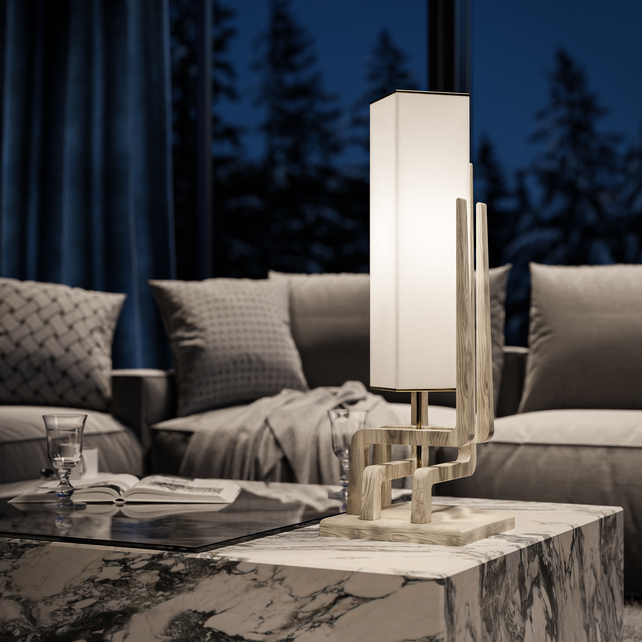 The lamp features a slender, rectangular shade body, mounted on a solid base. The shade is supported by a wooden structure with distinctly curved lines. The design seamlessly blends modernity with natural materials, creating an ideal fusion of nature and contemporary technology.